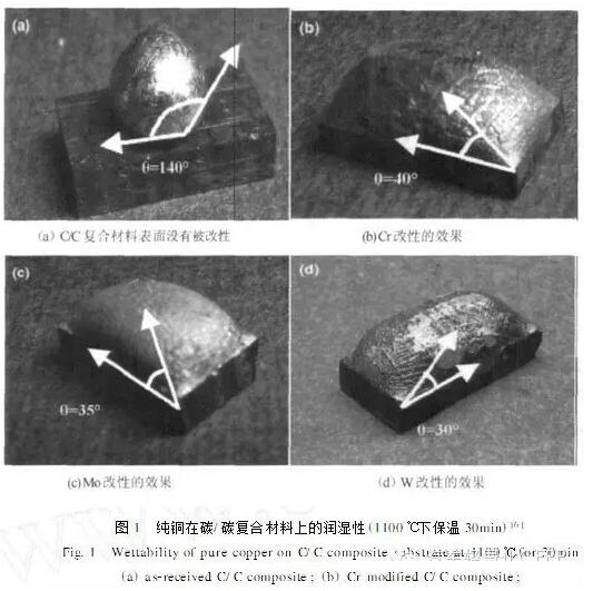 ITER分流裝置中的熱管為了具備高強度和高導(dǎo)熱性,通常是由最外層碳/碳復(fù)合材料包覆著銅合金。Pietro1 Appendino通過對碳/碳復(fù)合材料表面改性,直接將銅澆鑄在表面。他認(rèn)為,選用的ⅥB元素(如Mo,W,Cr)很容易與碳生成碳化物,而這些類似金屬的碳化物易于被熔化的銅所潤濕;各元素對復(fù)合材料表面改性后,銅的潤濕效果也不同(圖1)。