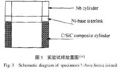 為了得到使用溫度較高的連接件,以滿足碳纖維材料的應(yīng)用需求,童巧英等人采用一種熔點較高的Ni基連接劑作中間層,用液相滲透方法對用二維和三維編制的碳/碳化硅復(fù)合材料與金屬鈮進(jìn)行連接。金屬鈮、碳/碳化硅連接試樣及中間層均制成圓環(huán)狀,如圖3所示放置。在1300℃、連接時間45min、真空狀態(tài)下進(jìn)行連接,所施壓力為20MPa。結(jié)果發(fā)現(xiàn),二維碳/碳化硅復(fù)合材料與金屬鈮的連接在從連接高溫降到室溫過程中已發(fā)生破壞,金屬鈮環(huán)與二維編織碳/碳化硅復(fù)合材料環(huán)發(fā)生脫離現(xiàn)象,而三維編織碳/碳化硅復(fù)合材料與金屬鈮環(huán)連接良好。這是因為,一方面,相對于三維碳/碳化硅復(fù)合材料,二維碳/碳化硅復(fù)合材料與金屬鈮的熱膨脹系數(shù)差異更大,使得在接頭產(chǎn)生較大的殘余熱應(yīng)力,降低了連接性能;另一方面,是由于二維碳/碳化硅復(fù)合材料纖維相對于連接面的垂直度不高,使得連接較弱。