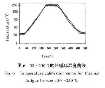 為了評估釬焊接頭的抗熱疲勞性能,需要進(jìn)行熱循環(huán)測試。例如,對碳/碳復(fù)合材料與鋁合金20242T3膠結(jié)接頭的熱循環(huán)測試溫度范圍為50~250℃,一次熱循環(huán)包含五個階段:(1)50℃保溫30s;(2)用120s升溫到250℃;(3)250℃保溫60s;(4)用120s降溫到50℃;(5)50℃保溫30s。圖6為一個熱循環(huán)溫度曲線,其中,虛線所示為實際溫度曲線。