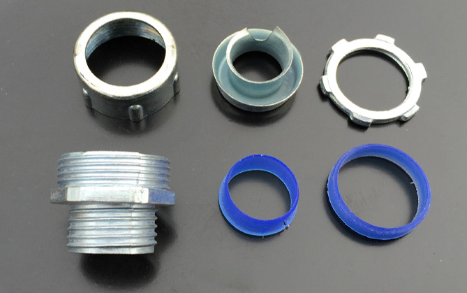 金屬軟管接頭細節:蓋螺母、牙圈、主體、橡膠圈、墊片