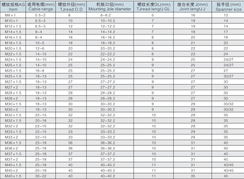 螺紋長(zhǎng)度:配合緊迫頭裝配省時(shí)便利,夾緊電纜范圍大,抗拉力強(qiáng)、可防水、防塵、抗鹽、耐酸堿、酒精、油脂及一般溶劑。