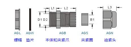 | ※ | 若分開訂購各零件時,請在型號后面加上各代號:螺帽(L) 墊片(W) 本體(B) 夾緊圈(S) 迫緊頭(N) 例:訂購AG-12螺帽,型號為AGL-12。 | |