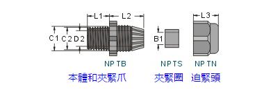 | ※ | 若分開訂購各零件時,請在型號后面加上各代號:本體(B) 夾緊圈(S) 迫緊頭(N)例:訂購NPT-14本體,型號為NPTB-14。 |